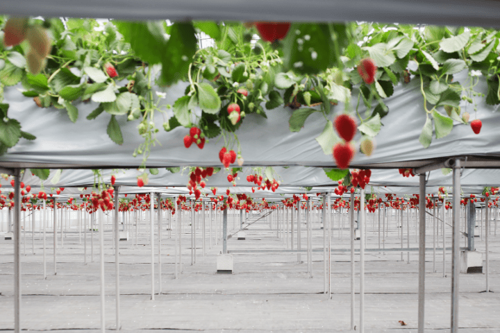 - 車いすやベビーカーでもいちご狩りが楽しめるようスロープが設置されており、棚幅も90cmと十分な幅が確保されています。